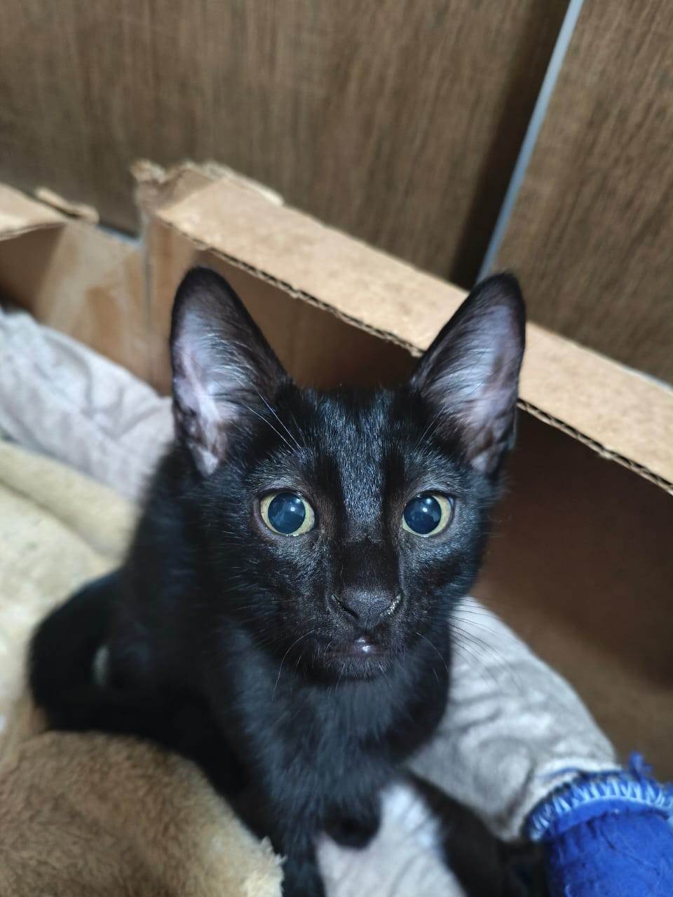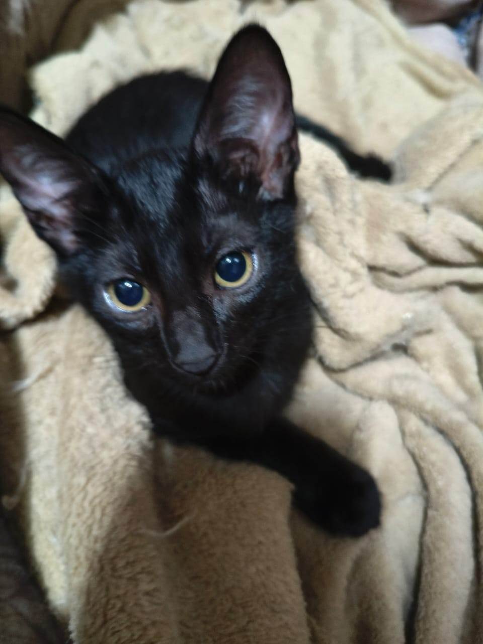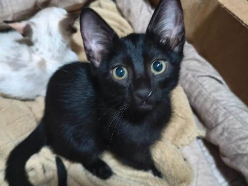 Gatinho preto macho, olhos mostarda, para adoção responsável.